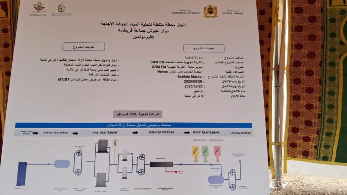 في خطوة ميدانية لتعزيز الإنصاف المجالي وتأمين الموارد المائية أشرف عامل إقليم بولمان على تدشين سلسلة من محطات تحلية المياه الجوفية بكل من دواوير بلصفرات، الماجن لعرجان ،أولاد عبد الكريم الرميلة. وعيوش تانديت. وتعتمد هذه المنشآت الحيوية على تقنية التناضح العكسي بطاقة إنتاجية تصل إلى 3 لترات في الثانية، مما ينهي معاناة آلاف المواطنين مع ملوحة المياه وندرتها.