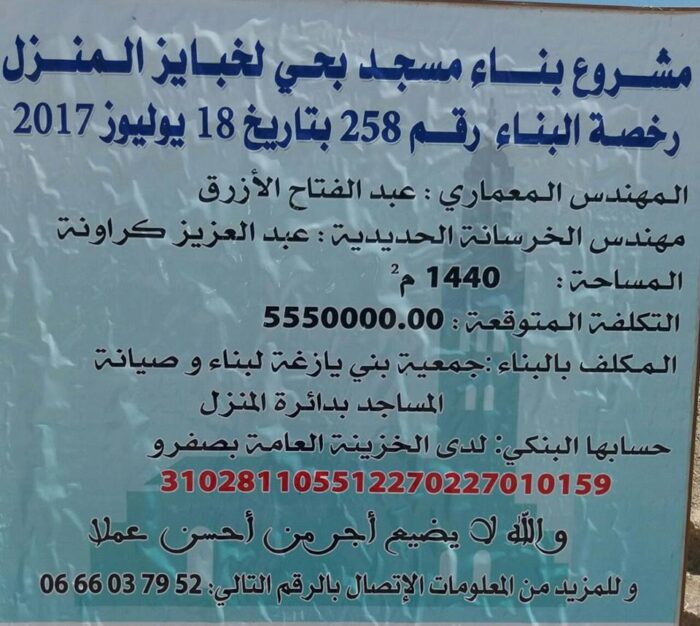 تسهر جمعية بني يازغة لبناء وصيانة المساجد بدائرة المنزل في الفترة الحالية على العمل على إنجاز وإنجاح مشروع بناء مسجد بحي الخبايز بمدينة المنزل. إذ سيتم تشييد الجامع على مساحة 1440 متر مربع بهذا الحي الذي لا يتوفر على أية مساجد. على بقعة أرضية ساهم بها سلفا أحد المحسنين مشكورا. ومن المتوقع أن تبلغ تكلفة الأشغال 5.550.000،00 درهم. حيث أن نجاح هذا المشروع الخيري سيقلص إلى حد كبير مشكل الاكتظاظ الذي تعاني منه المساجد الصغيرة بالمدينة والتي لم تعد قادرة على تحمل واستيعاب أفواج المصلين التي تتزايد بشكل مطرد كل سنة. وهي فرصة لدعوة كافة المحسنين للمساهمة في تشييد هذه المعلمة الدينية كل حسب استطاعته عبر حساب الجمعية البنكي لدى الخزينة العامة بصفرو: 310281105512270227010159. والله لا يضيع أجر من أحسن عملا.