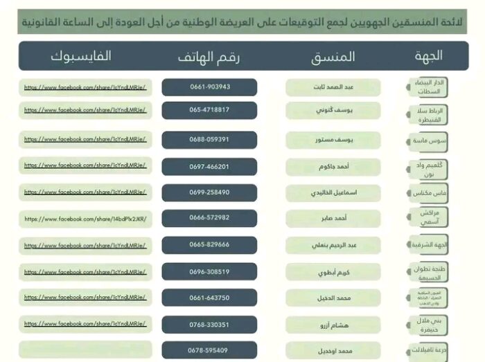 أعلنت العريضة الوطنية من أجل العودة إلى الساعة القانونية (غرينتش) عن أسماء المنسقين الجهويين بمختلف جهات المملكة، بهدف تمكين المواطنات والمواطنين من التواصل مباشرة مع منسق جهتهم للتوقيع والانخراط في هذه المبادرة المواطنة.