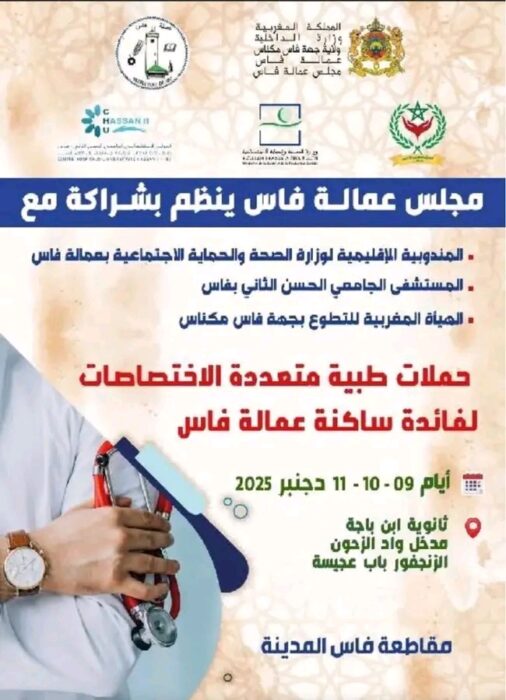 وتمتد هذه الحملة على مدى ثلاثة أيام، 09 و10 و11 دجنبر 2025، لتقديم خدمات صحية مجانية لفائدة المواطنين، وذلك بـ ثانوية ابن باجة، مدخل واد الزحون – الزنجفور باب عجيسة، في مقاطعة فاس المدينة.