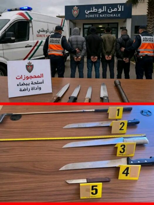 وأسفرت عمليات التدخل والتفتيش عن حجز مجموعة من الأدوات التي يُشتبه في استخدامها في هذه الأفعال الإجرامية، من بينها أربعة أسلحة بيضاء وأداة راضة، ما يعكس طبيعة العنف الذي رافق هذه الجرائم.