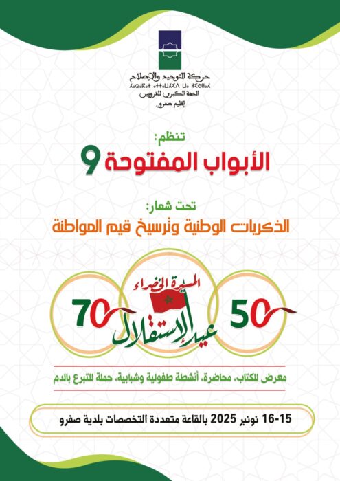 تشهد مدينة صفرو نهاية هذا الاسبوع تنظيم برنامج حافل من الانشطة التربوية والثقافية والاجتماعية، وذلك بمبادرة من جمعية حركة التوحيد والاصلاح التي اطلقت اياما مفتوحة يومي السبت والاحد 15 و16 نونبر 2025، بالقاعة المتعددة التخصصات قرب حديقة زنطق.