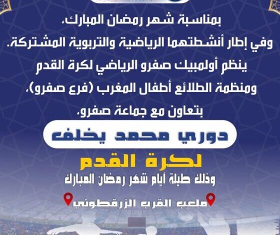 بمناسبة حلول شهر شهر رمضان المبارك، وفي خطوة تهدف إلى ضخ دماء جديدة في المشهد الرياضي المحلي بمدينة صفرو، أعلن نادي أولمبيك صفرو الرياضي لكرة القدم، بشراكة مع منظمة الطلائع أطفال المغرب (فرع صفرو) وبتعاون مع جماعة صفرو، عن إطلاق فعاليات النسخة الأولى من “دوري محمد يخلف” لكرة القدم، والذي ستحتضن منافساته أرضية ملعب القرب الزرقطوني.