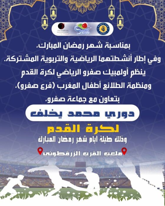 بمناسبة حلول شهر شهر رمضان المبارك، وفي خطوة تهدف إلى ضخ دماء جديدة في المشهد الرياضي المحلي بمدينة صفرو، أعلن نادي أولمبيك صفرو الرياضي لكرة القدم، بشراكة مع منظمة الطلائع أطفال المغرب (فرع صفرو) وبتعاون مع جماعة صفرو، عن إطلاق فعاليات النسخة الأولى من “دوري محمد يخلف” لكرة القدم، والذي ستحتضن منافساته أرضية ملعب القرب الزرقطوني.