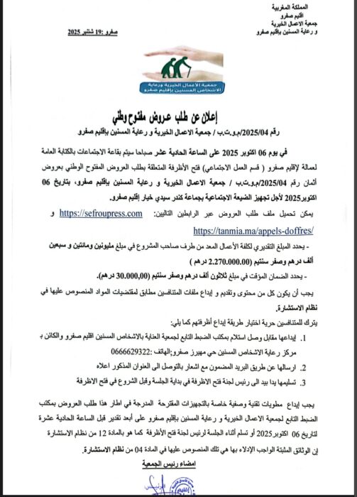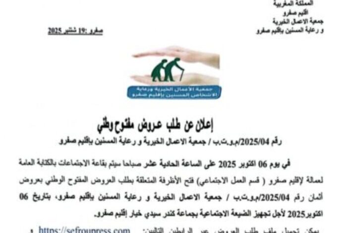 إعلان عن طلب عروض مفتوح وطني رقم 04/2025 لجمعية الأعمال الخيرية ورعاية المسنين بإقليم صفرو لتجهيز الضيعة الاجتماعية بجماعة كندر سيدي خيار