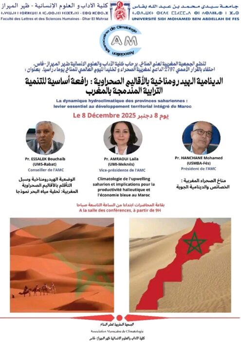 يوم دراسي ملهم ينظمه الجمعية المغربية لعلم المناخ برعاية كلية الاداب والعلوم الانسانية بفاس يوم الاثنين 8 دجنبر 2025 تحت شعار الدينامية الهيدرومناخية للاقاليم الصحراوية رافعة اساسية للتنمية الترابية المندمجة بالمغرب